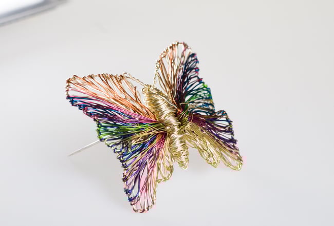 This gold rainbow butterfly pin is handmade of colored copper and silver wire.